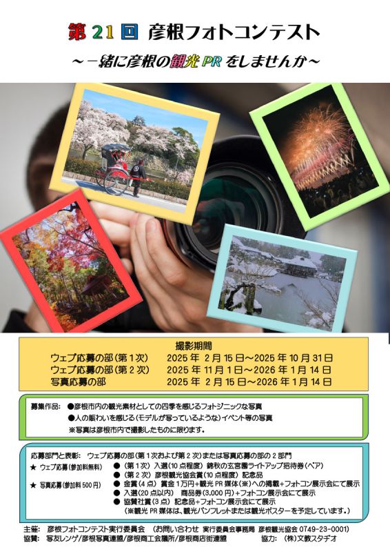 コンテストは写真応募の部とネット応募の部に分かれており、それぞれ、彦根市内で開催される観光イベント、彦根の豊かな四季折々の自然風景や動植物、彦根城および寺社仏閣・名所旧跡・祭りや風物、人々の暮らしや街角風景がテーマとなります。